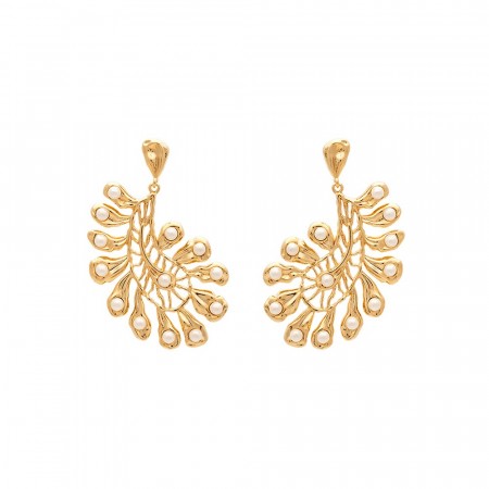 nike gullfargede øreringer med detaljerte ammonittskjell og naturlige ferskvannsperler. En perfekt blanding av havinspirert eleganse og tidløs stil. Like fine til en enkel sommerkjole som til en elegant kveldslook.