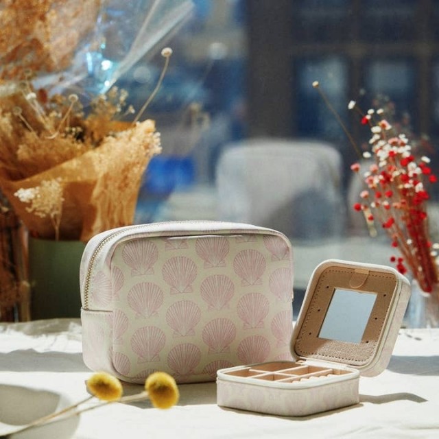 Ekslusiv collab mellom AVI Accessories og Stone & Stich. Oppbevar smykkene dine med stil! Smykkeskrinet har et delikat design med et mykt rosa skjellmønster på en lys, nøytral bakgrunn – inspirert av kystens rolige og feminine uttrykk.