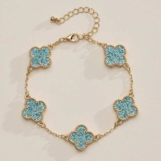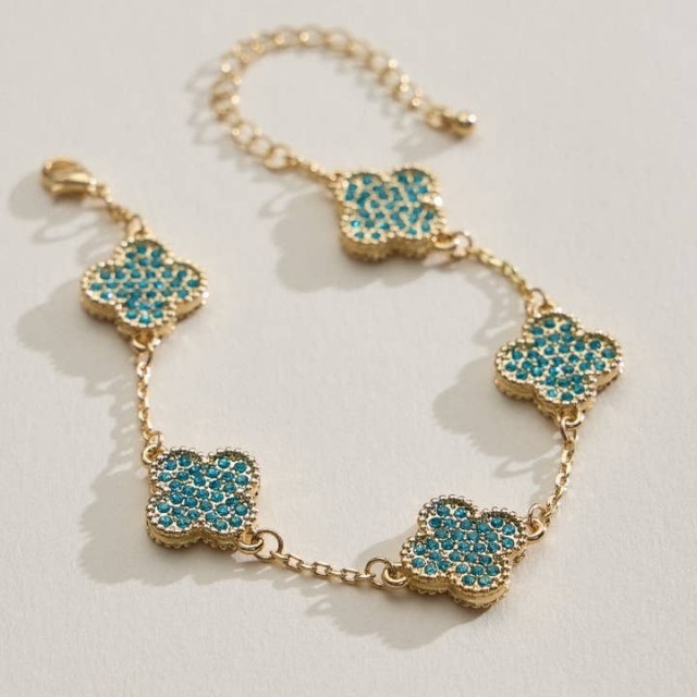 Dette vakre armbåndet er dekorert med intrikat utformede blomstercharms, hver utsmykket med glitrende steiner som reflekterer lyset på en elegant måte. De fine perledetaljene rundt hver blomst gir et eksklusivt preg og fremhever håndverksfølelsen i designet.