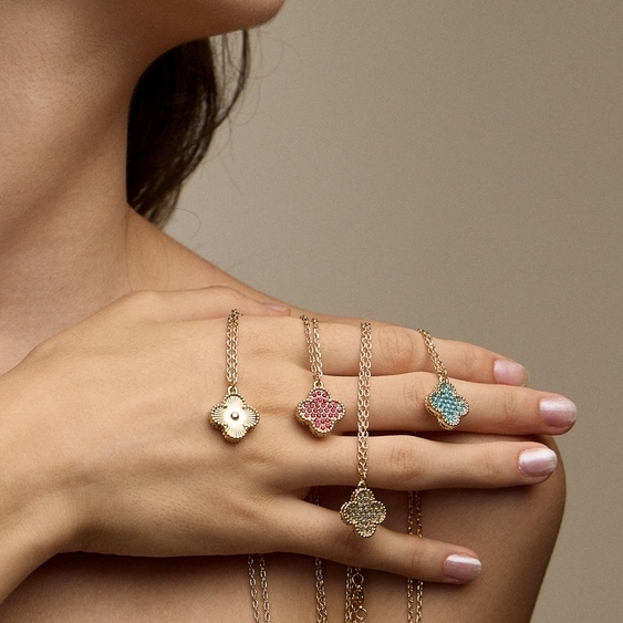 Anhenget har et delikat blomsterinspirert design med en glitrende pavéfinish, innrammet i en teksturert gullfarget setting som gir ekstra dybde og karakter. Resultatet er et smykke som fanger lyset fra alle vinkler og tilfører en subtil, men iøynefallende sparkle til ethvert antrekk.