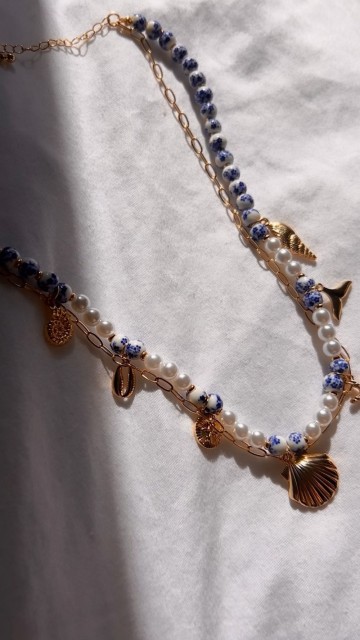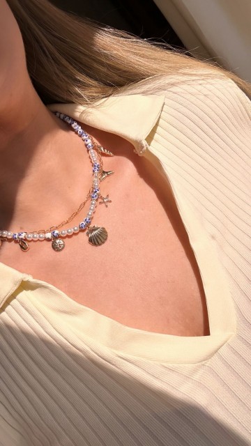 Kjedet består av to harmoniske lag: en moderne gullfarget paperclip-lenke som gir et trendy uttrykk, og et dekorativt perlekjede utsmykket med glassperler, keramiske blomsterperler og delikate havinspirerte charms. Blant detaljene finner du blant annet skjell, sjøstjerne og hvalhale – symboler som gir assosiasjoner til strandliv og ferie.