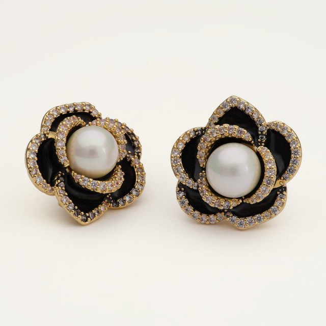 Disse spektakulære øredobbene kombinerer kunstnerisk design med klassisk eleganse. Formet som blomster, prydes de av en stor, glansfull perle i midten. Kronbladene er dekorert i sort emalje med gullkant, utsmykket med små, klare krystaller som tilfører glitrende kontrast. Resultatet er et smykke med dramatisk og luksuriøs utstråling.