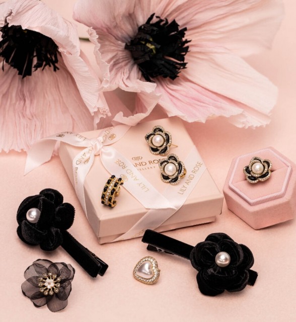 Dekorert med sorte kronblader og klare krystaller