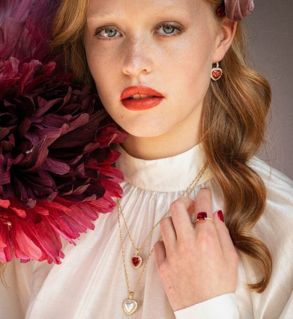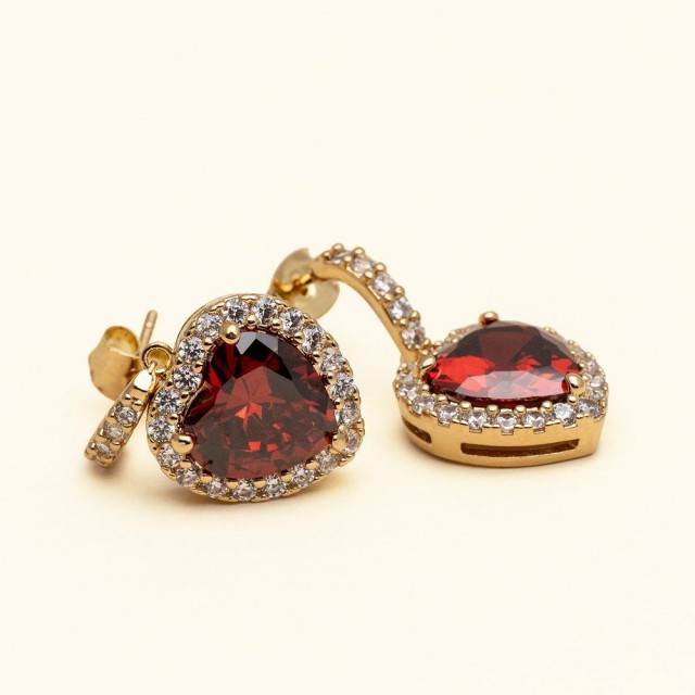 Disse iøynefallende øredobbene kombinerer romantikk og luksus i ett design. Midten prydes av dype, rubinrøde krystaller formet som hjerter, innrammet av en sirkel av små, klare stener som forsterker glansen. Den elegante bøylefesten, dekorert med krystaller, tilfører ekstra gnist og et sofistikert preg.